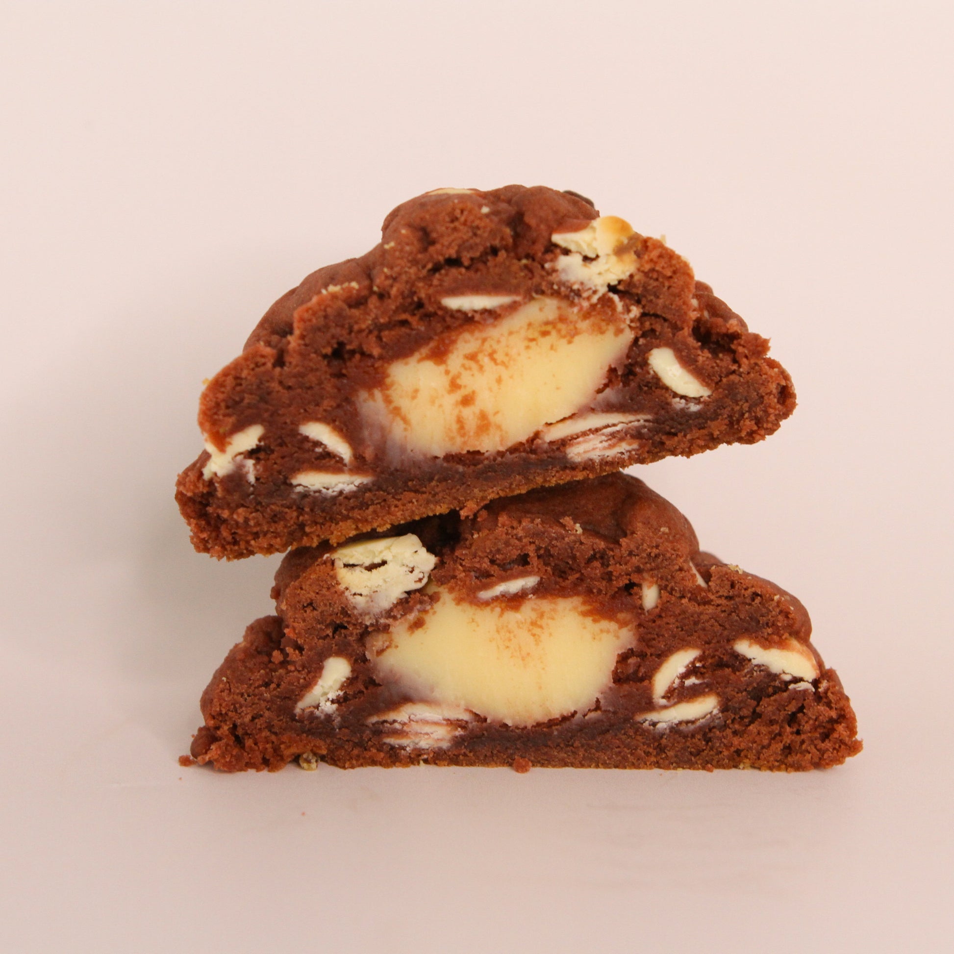 Our red velvet cheesecake cookies are made from a dutch-processed coca dough base and is mixed with couverture premium white chocolate chips, then stuffed with our house made sweet cream cheese filling